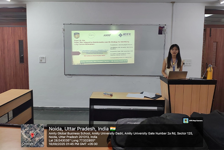 NU BTech Biotechnology student Ms. Jamyang Tshomo presented her joint R&D work, “Integrative Bioinformatics and ML Strategy for Identifying Lung Cancer Biomarkers” at the 12th International Conference on Reliability, Infocom Technologies and Optimization (ICRITO 2025) — an IEEE & ANRF sponsored conference held at Amity University, Noida, on 18–19 September 2025.